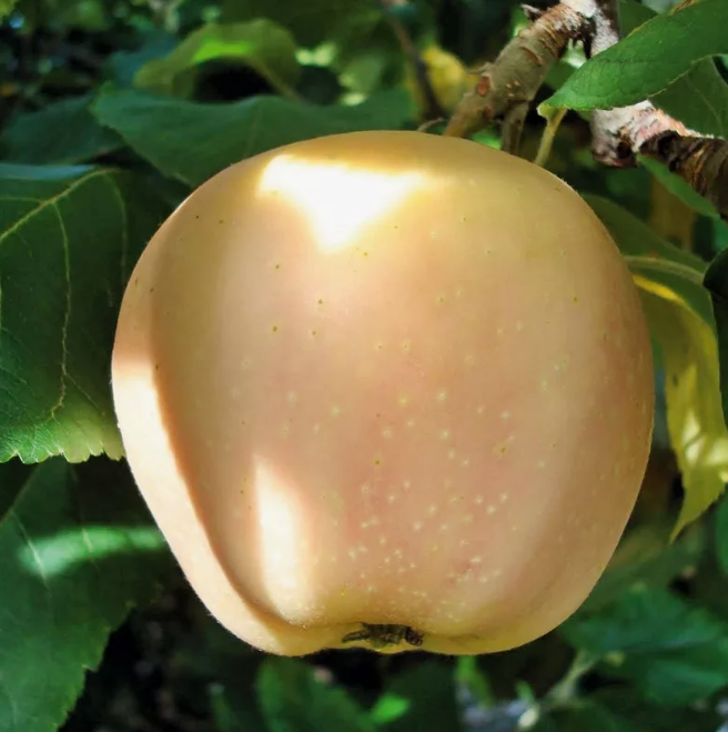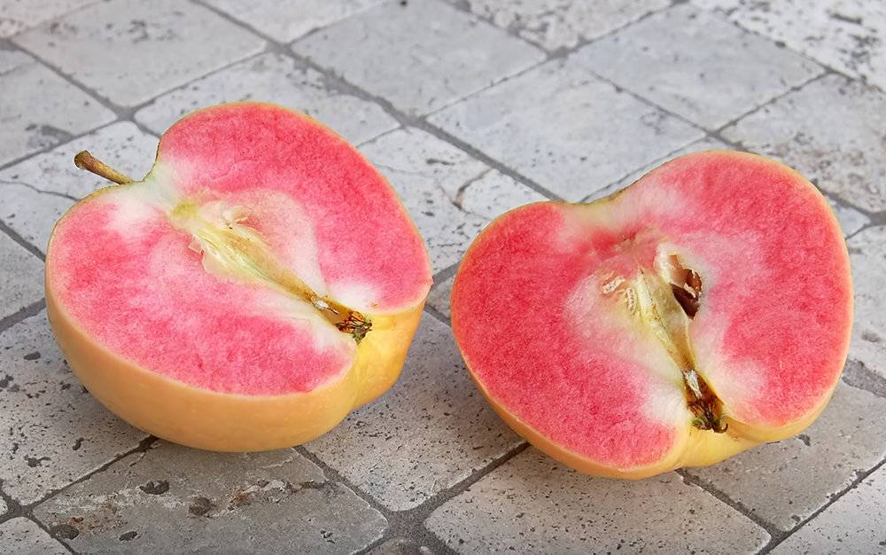 Красномясый сорт. Высота растения – 4 м. Желательно держать высоту 3,5 м путем обрезки. Особое внимание привлекают красивые цветки ярко-розовой окраски. Яблоки средние по размеру, их вес – 150-200 г. Окраска желто-зеленая или сливовая, кожица полупрозрачная, заметны миниатюрные белые подкожные точки. Мякоть плодов ярко-красная или розовая с перламутровым оттенком, сочная, хрустящая, имеется ярко выраженный аромат. На вкус фрукт сладкий, терпкий, ощущаются малиновые или грейпфрутовые нотки. Зимостойкий сорт. Это самобесплодный сорт, поэтому нужно использовать опылителей, то есть сорта с тем же сроком созревания (позднелетний).